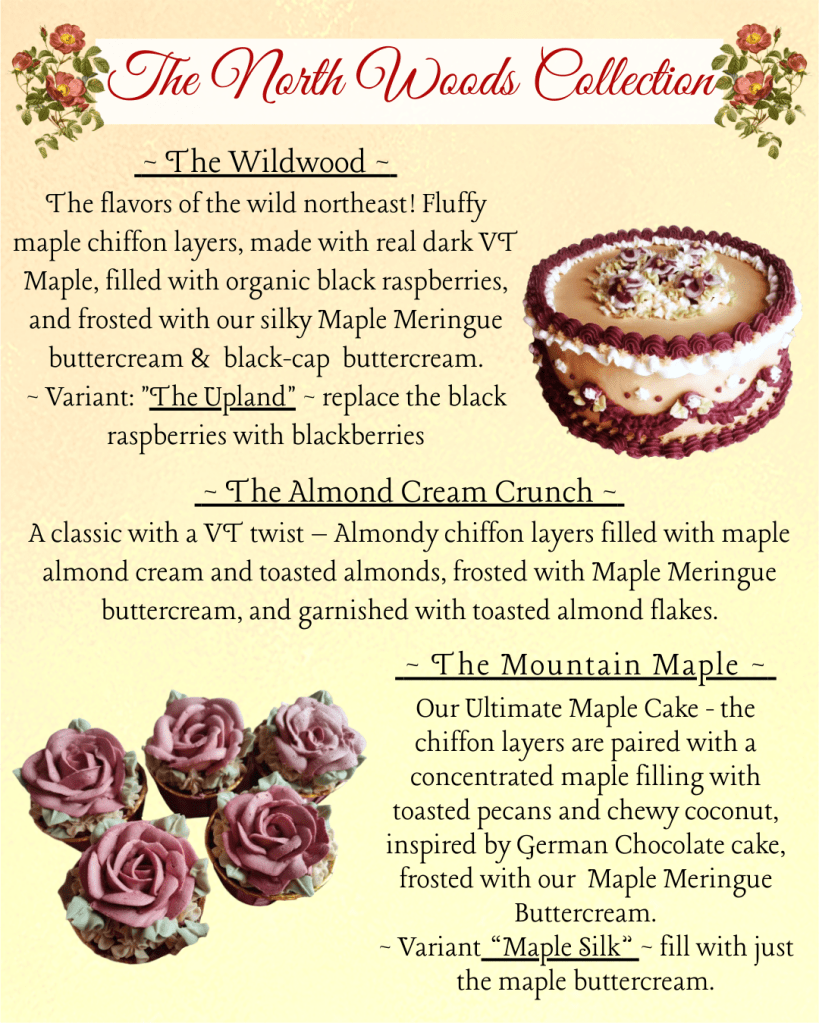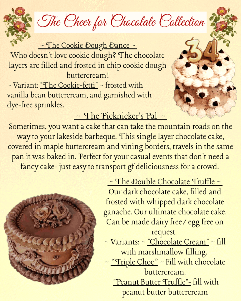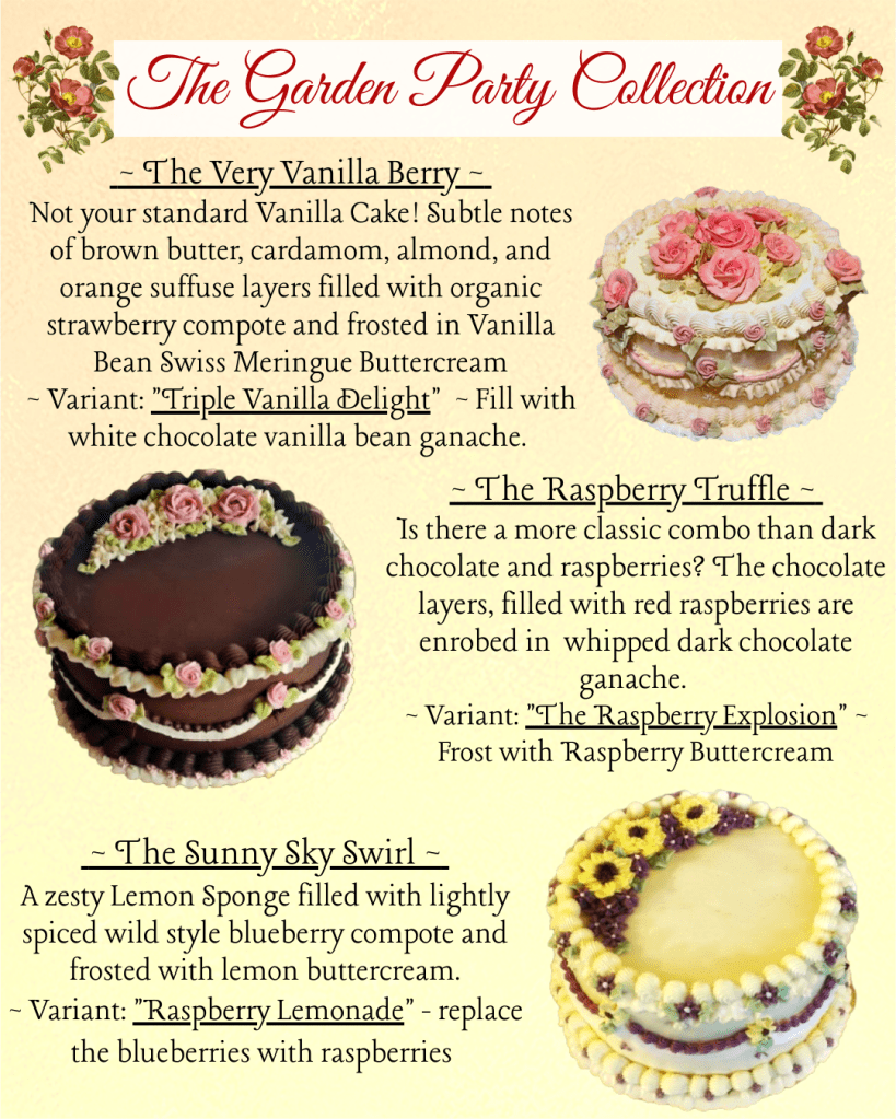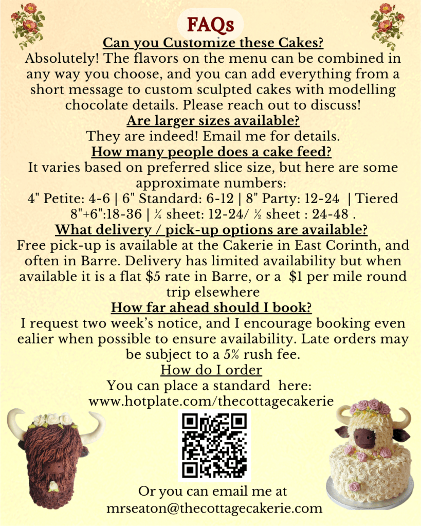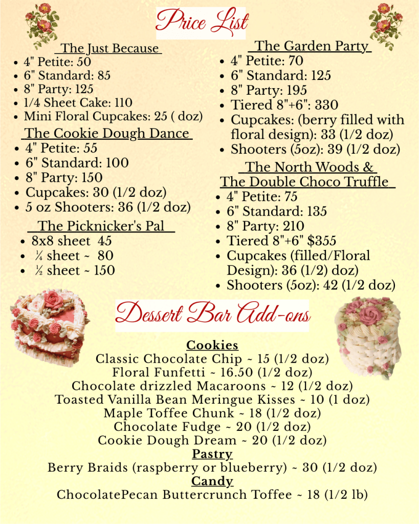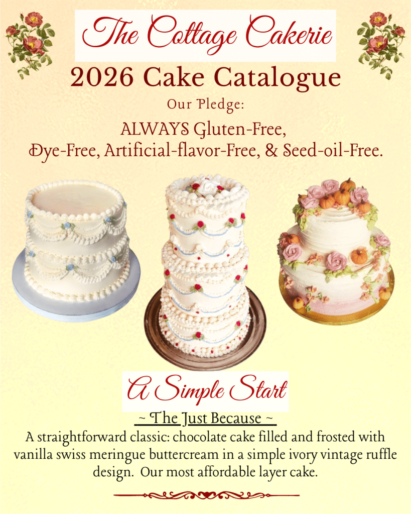 Here is my custom order Cake Catalogue for 2026. For Seasonal Specials and Holiday pre-orders please check the blog, or my facebook page. Please email me with any questions, or to send an inquiry!